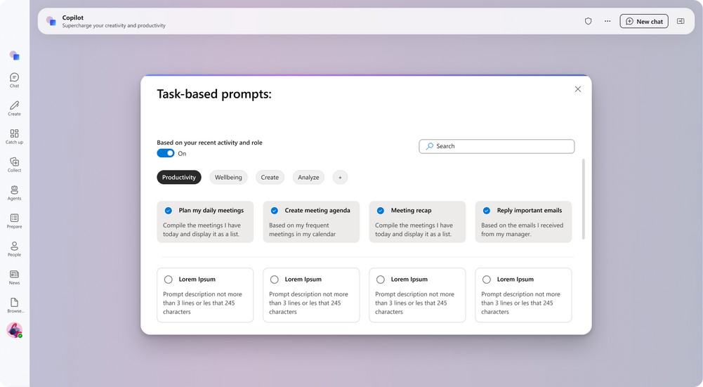 The current Copilot home screen has a lot going for it. Clean layout, familiar patterns, solid Fluent design language. But the prompt suggestions are generic by default — the same cards for everyone, regardless of your role, your calendar, or your recent activity.